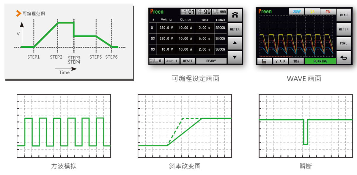 ? 輸入電壓范圍測試:具GROUP和STEP,可設定階段式或連續的電壓與電流變動,也可改變爬升和跌落速度,或模擬電源瞬時斷電情形,不需編寫程序,即可做多項電源模擬。