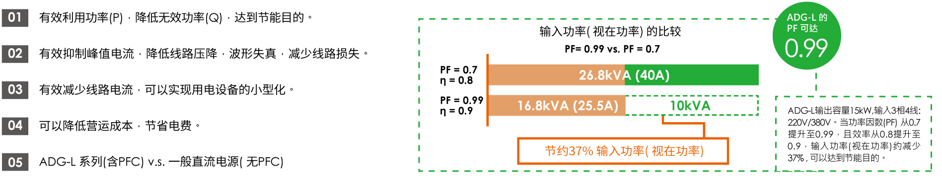 內(nèi)建主動(dòng)式功率因數(shù)校正線路,可以提升輸入功率因數(shù)≧0.99