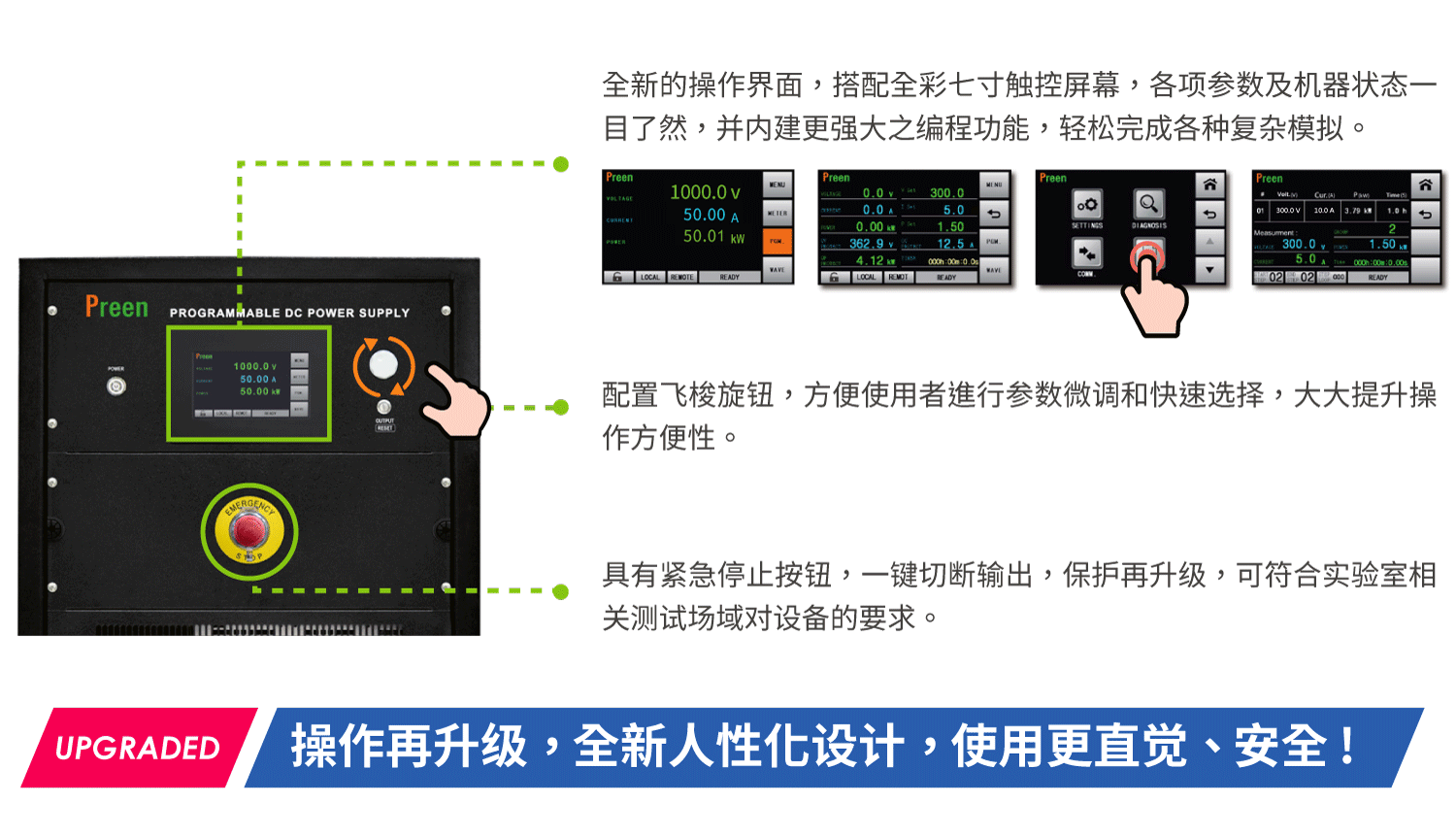 大型7吋觸摸屏與飛梭旋鈕操作,各項數據一目了然,具有過壓,過流,短路,過溫等保護功能。